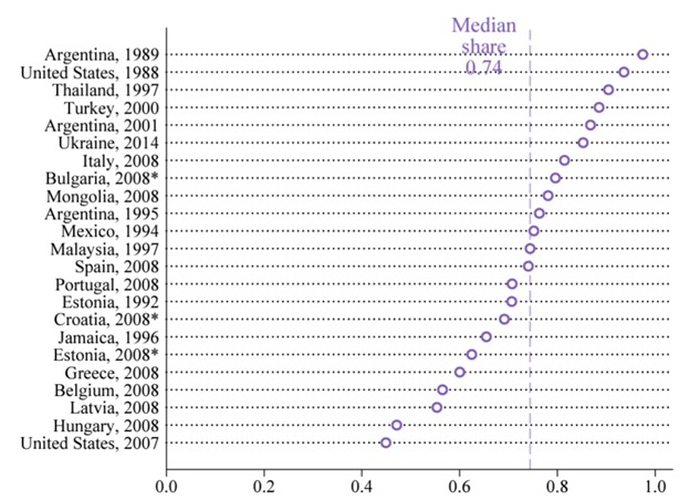 Notes: (i) This figure plots the share of firm credit in non-performing loans for a sample of 23 systemic financial crises, as defined above. (ii) We plot values for the year where the overall non-performing loan ratio reaches its peak after 10 years following a crisis. (iii) * indicates countries that experienced deep recessions during 2008 following large credit expansions but had no financial crisis, according to Laeven and Valencia (2020).