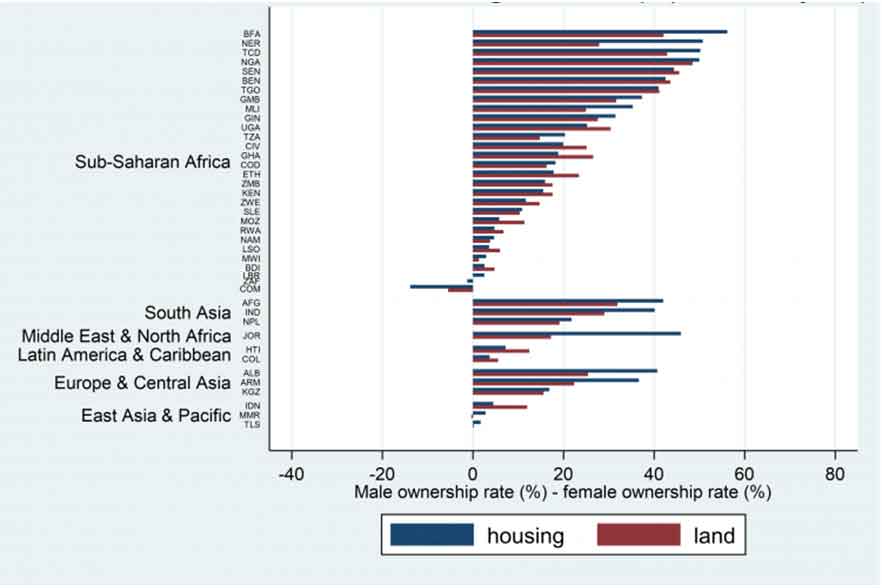 Notes: (i) See here for a list of country codes. (ii) A positive value indicates that more men than women own property. (iii) Differences are in terms of percentage points.