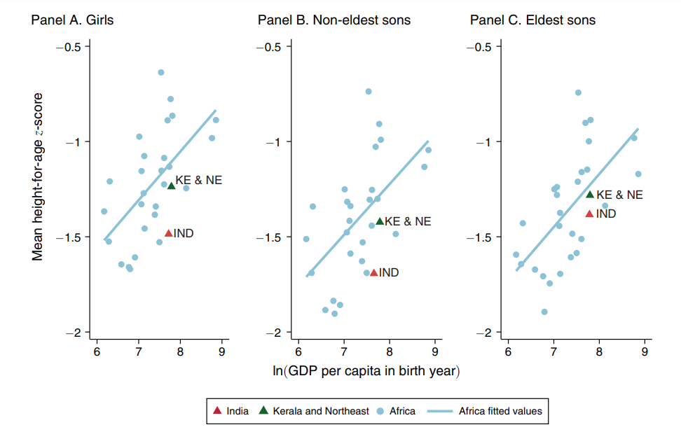 Notes: i) The difference between the gap between the Africa fitted line and Kerala and Northeast and the gap between the Africa fitted line and India is 0.231 for girls, 0.235 for non-eldest sons, and 0.098 for eldest sons. ii) GDP data are based on the Penn World Table 9.0 (Feenstra et al. 2015).