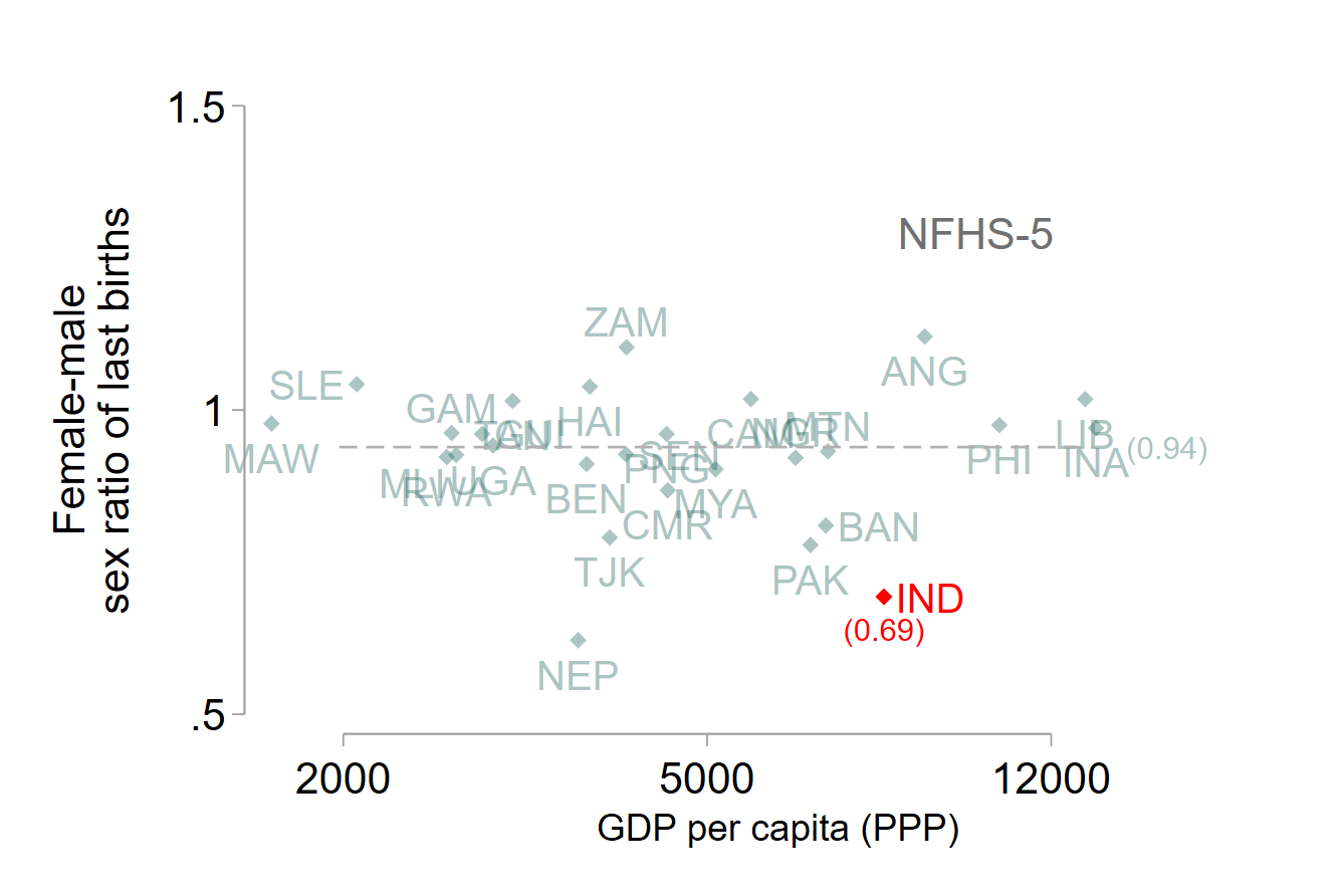 Two measures of the desire for a son are the population sex ratio, which becomes skewed through sex selection or excess mortality of girls, and the sex ratio of the final child in a family, which also incorporates the practice of couples having more children to obtain a son. India is exceptionally low compared to other countries on both metrics, and this pattern has been persistent. Figure 2 shows this metric of the sex ratio of last births in India compared to other countries – India’s ratio is 0.69 girls per boy, while the average among other countries is 0.94.