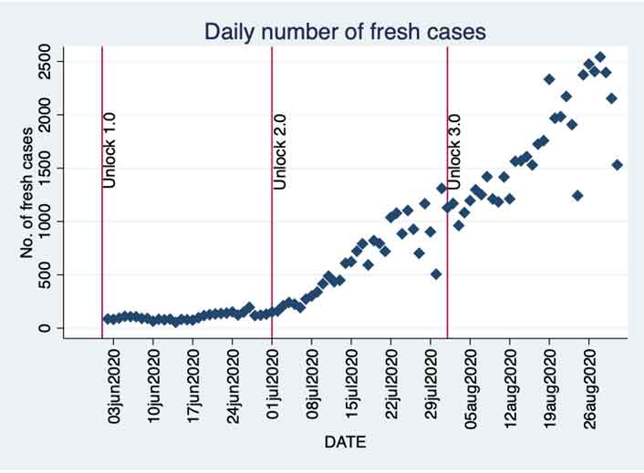 The state of Kerala, where the first case of Covid-19 infection was registered in India, and also the state with the largest number of cases when the country entered the lockdown on 25 March, made a remarkable turnaround and had only 16 active cases on 20 May, 100 days after the first case was registered. Kerala received widespread appreciation for this. But the second wave of the pandemic in the state, coinciding with the ‘unlocking’ phase in the country, has proven to be a serious crisis. Daily fresh cases are now well over 2,000 on most days, and a very high share of these are ‘infections via contact’. So, what went wrong? I try to look into this question by considering the pandemic data during the various unlock phases which started with Unlock 1.0 on 1 June, followed by Unlock 2.0 on 1 July, and Unlock 3.0 on 1 August.