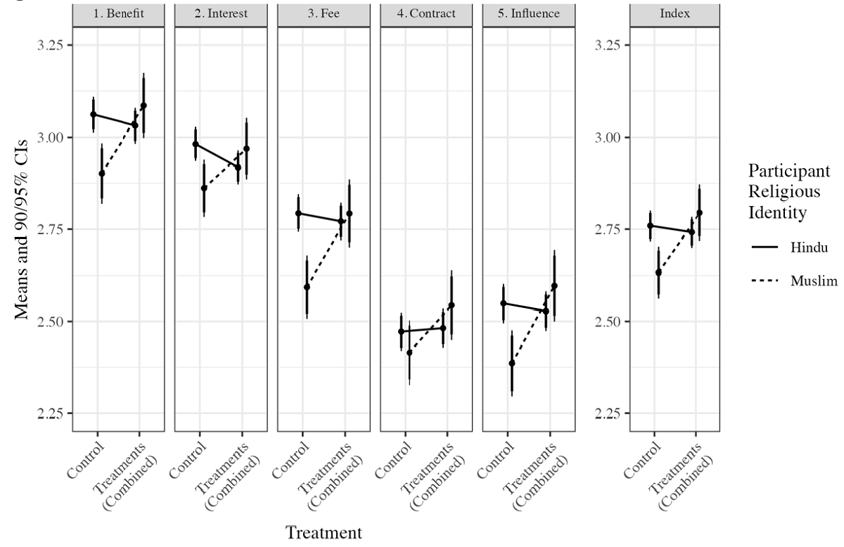 We find that that Muslims showed greater willingness to contribute to the initiative in response to the treatment (intervention), whereas treated Hindus were no more willing to contribute than those in the control group (not subject to any intervention) (Figure 2). This is surprising given the dominant diversity-deficit hypothesis; we had expected homogeneous areas, that is, majority Hindu or Muslim neighbourhoods, to be the most willing to increase their contributions to the collective good in response to the accountability mechanisms.
