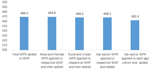 The second factor is the level of disaggregation at which key ratios are calculated. As per NSSO (2008), when calculating workforce estimates, one should ideally decide the lowest level of disaggregation of the population at which the projection is to be made, obtain employment ratios for each domain at that level, and then apply these to the corresponding population projection. Summing each domain from the lowest to the highest level gives us the workforce numbers. As we can see in Figure 1 below, the final workforce estimates are sensitive to the level of disaggregation.