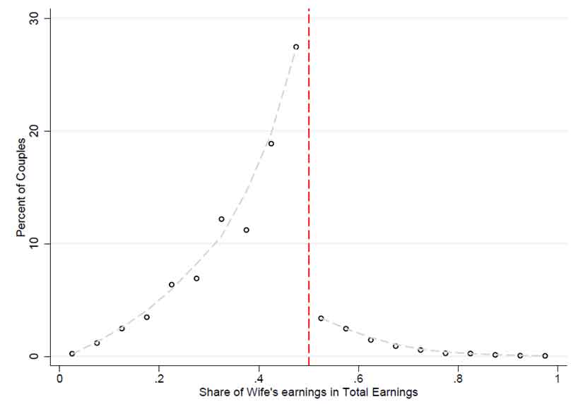 - For couples working in the same industry and occupation, one can expect that the spike at 50% share of income is institutional as they get paid the same wages. I find that even for couples who work in different industries and occupations the discontinuity (although smaller) exists.
