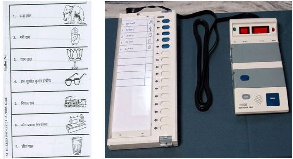 Figure 1. Paper ballots and Electronic Voting Machines used in India