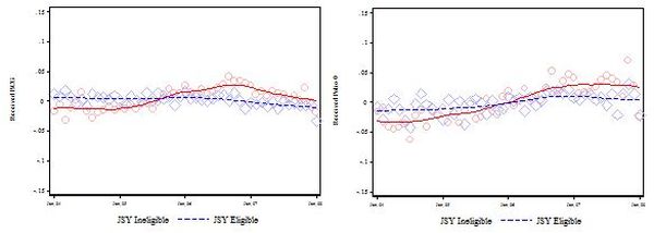 Note: Blue dotted line depicts JSY eligible and red line depicts JSY ineligible.Source: Author´s calculations using DLHS-III (2007-08) data.