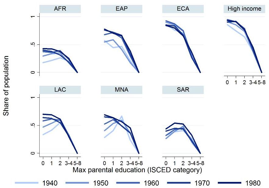 It turns out that the relationship between absolute mobility and parental education is indeed different in developing economies, more like an inverted-U than the declining function seen in high-income economies (Figure 4). The different panels of Figure 4 correspond to the average economy in each of the six different developing regions, as classified by the World Bank. The different shades of blue refer to different cohorts, with darker shades denoting younger cohorts. The inverted-U suggests that individuals with less-educated parents, who are likely to be poorer, are also less likely to be upwardly mobile in developing economies. That the inverted-U is most pronounced in the two poorest regions, Sub-Saharan Africa and South Asia, is particularly suggestive: poorer the region, more likely it is that individuals born to parents who do not have an education lack the means to get an education, which creates something akin to a poverty trap. Fortunately, this poverty trap appears to be weakening with each new generation, as the inverted-U gradually morphs into the pattern observed for the average high-income economy as regions become richer.