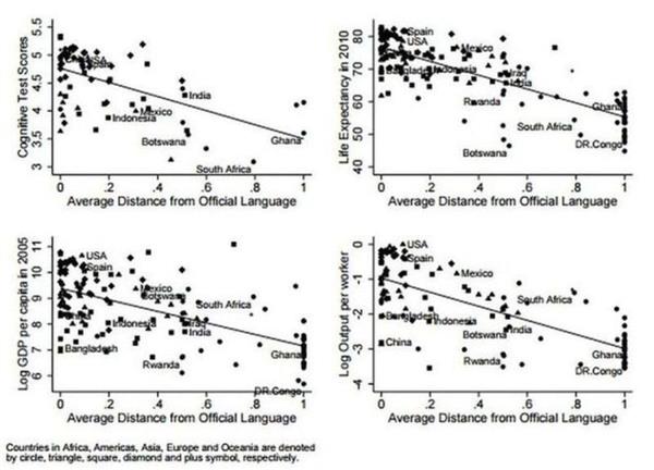 The constructed measure of language distance and exposure, in line with our theory, is seen to be a statistically significant and economically meaningful correlate of proxies for human capital, health, income, and productivity (see Figure 1). The pattern of lower distance to the official language, implying higher country wealth and human development, holds both within and across continents. Studying factors affecting official language choice, we find that possessing a writing tradition is a key explanatory factor, rather than past wealth or development levels. Using distance from the sites of invention of writing as a predictor of possessing a writing tradition, and consequently ADOL, we provide a causal logic linking higher distance from the official language to lower levels of socioeconomic development. The economic magnitude of the estimates is large, and shows that if a country like Zambia were to adopt Bemba instead of English as its official language, it would move up 44 positions on the human development index (HDI) ranking and become similar to a country like Paraguay in human development.