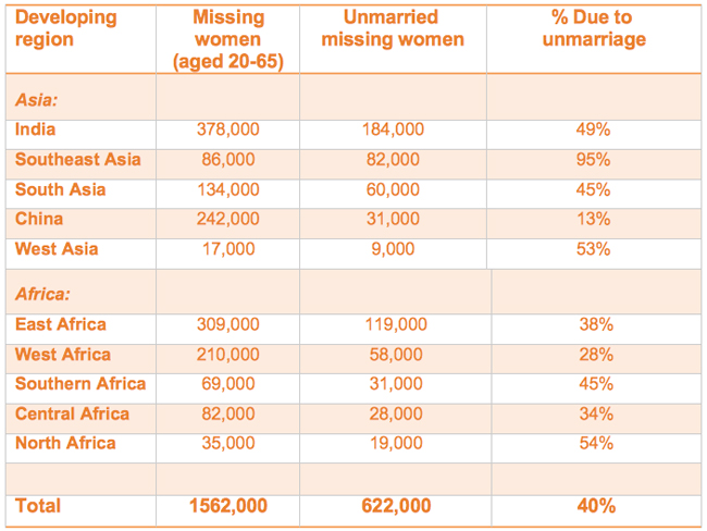 Approximately 70% of the missing unmarried women are of reproductive age (20-45). These younger unmarried women are classified as missing precisely because in Asia and Africa, their death rates relative to those for unmarried men are extremely high compared to the same ratio in benchmark developed countries. The significant discrepancy stems from limited access to resources and healthcare for this very socially marginalised group.