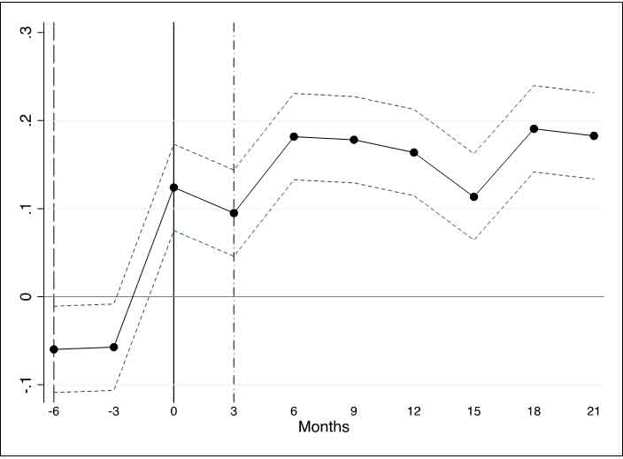 Importantly, we find that the above short-term effects of the programme on savings and health benefits also persist in the medium term. Using administrative (non-self-reported) data obtained from the official records of the cooperative bank and local health clinics, we find that the treatment group sex-workers were 53 percentage points more likely to keep their accounts open 15 months after the programme ended, along with higher account balances. They were also 15 percentage points more likely to continue with preventive health check-ups, 21 months after the programme (Figure 2). It is striking that this is despite no discussion of health issues during the eight-week programme.