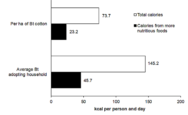 Our study confirms that income gains through Bt cotton adoption among smallholder farm households in India have positive impacts on food security and dietary quality. The cash income gains are used by households to purchase more and better food. While GM crops are not a panacea for the problems of hunger and malnutrition, our findings suggest that they can be an important component in a broader food security strategy. So far, food security impacts are confined to only a few concrete examples, such as Bt cotton. The nutritional benefits could further increase with more GM crops and traits becoming available in the future, including food crops. Appropriate policy and regulatory frameworks are required to ensure that the needs of poor farmers and consumers are taken into account and that undesirable social consequences are avoided.