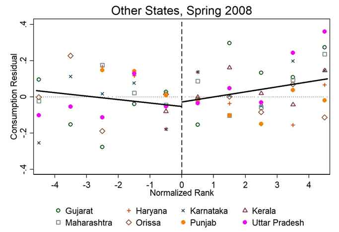 Note: Each dot depicts mean consumption, suitably normalised, in one district. Districts to the left of zero have had the MNREGA at the time of the consumption survey, while districts to the right had not.
