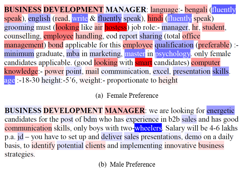 Notes: (i) Panels (a) and (b) show job postings with an explicit female and male preference, respectively. (ii) Words highlighted in red reflect female associations while those in blue reflect male associations. (iii) Colour intensity reflects the strength of the attached gender association, with darker shades indicating a stronger association.