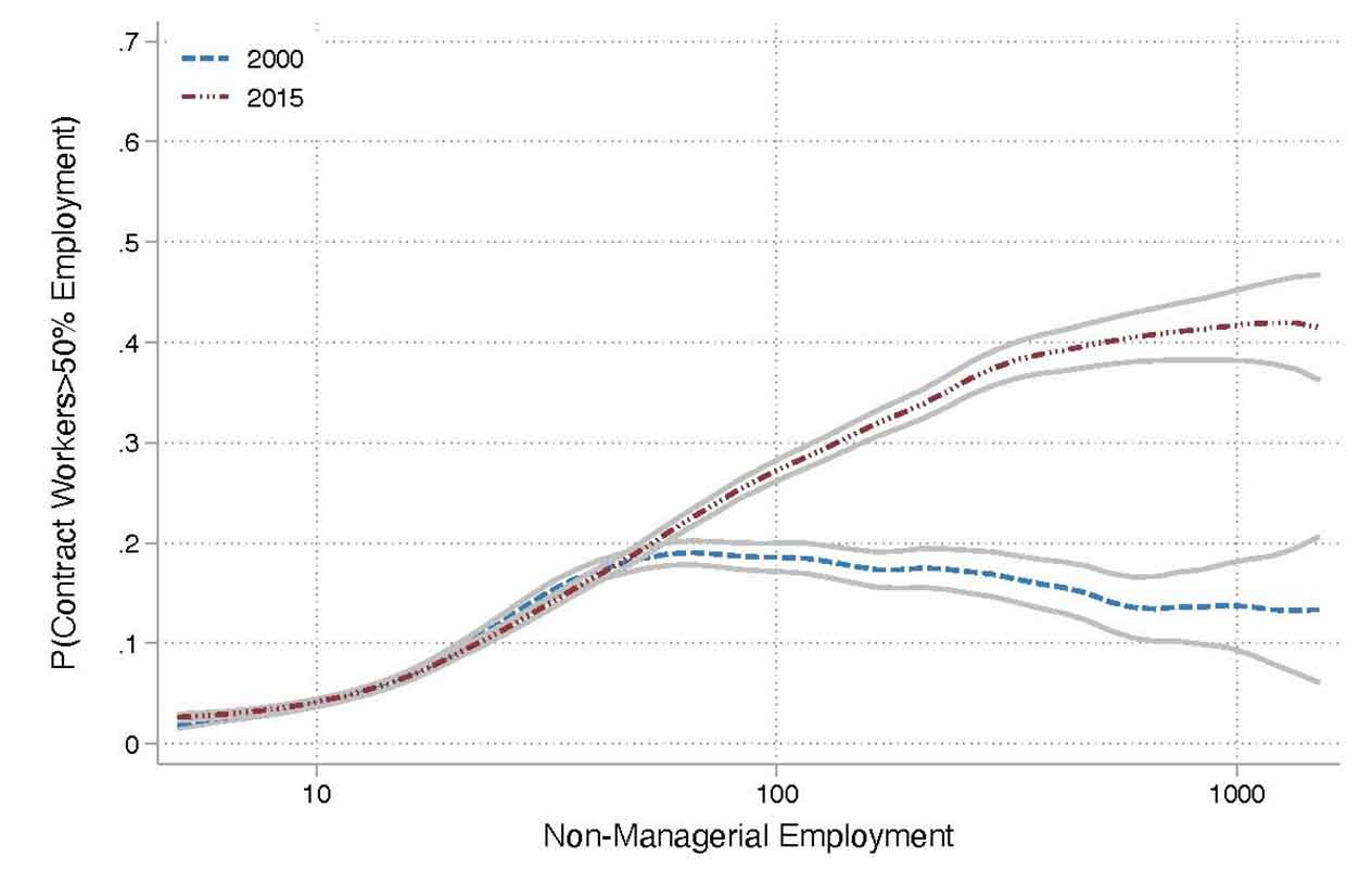 Note: Plot shows point estimates and 95% confidence intervals from non-parametric regression of the probability a plant hires more than 50% of its non-managerial workers through contractors on (log) non-managerial employment.