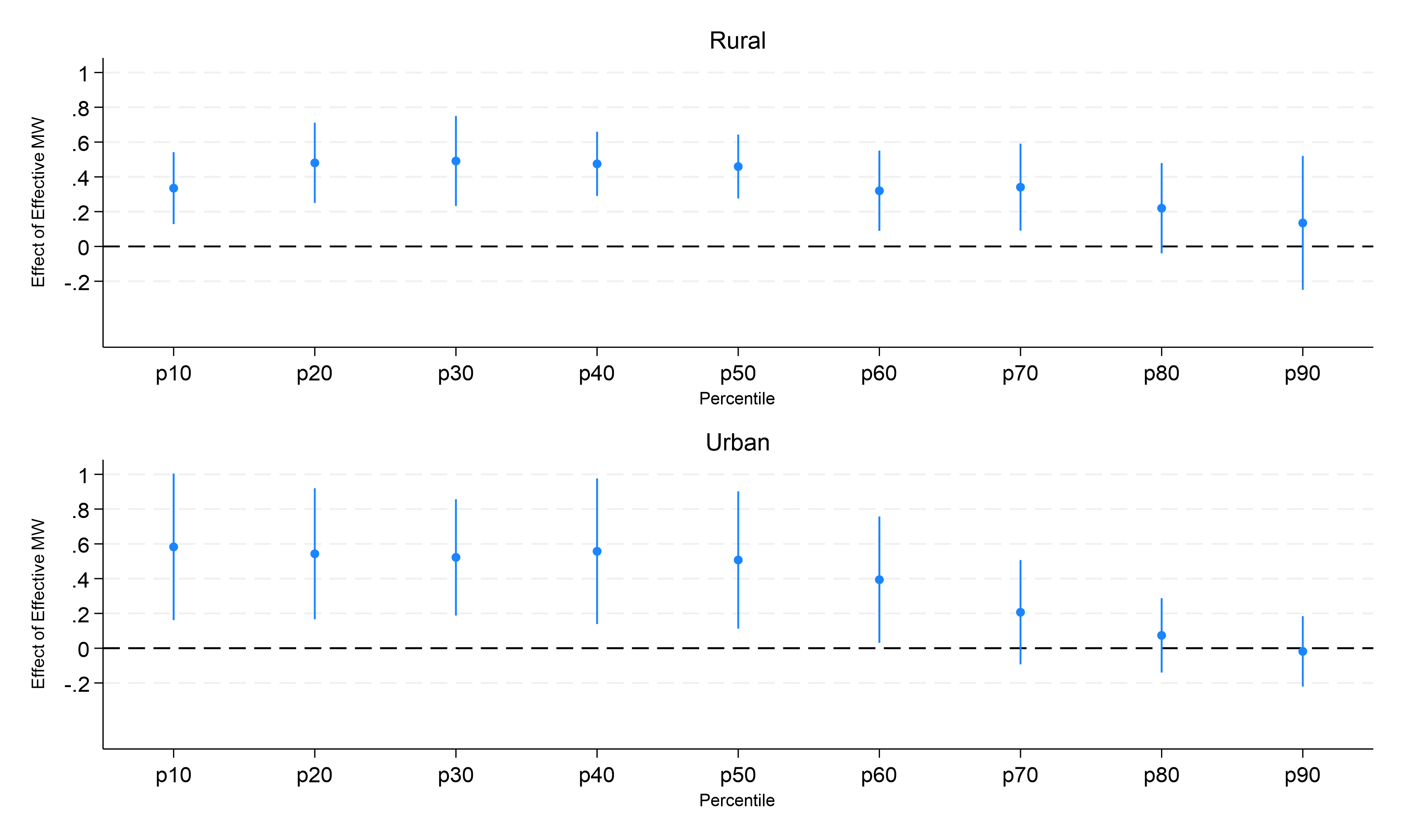 Additionally, we redefine the minimum wage variable to account for its relative position within the local wage distribution.4 We construct an ‘effective minimum wage’, defined as the gap between the legislated minimum wage and the average wage of high-skilled workers within a state and sector5. The impact of variations in the effective minimum wage is assessed on the wage gap between different percentiles of the wage distribution and the average wage for high-skilled workers6. This approach accounts for state-level wage differences, allowing us to examine spillover effects and potential non-compliance7. Our findings in Figure 2 show that minimum wages have positive spillover effects, impacting wages up to the 80th percentile in rural areas and the 60th percentile in urban areas.