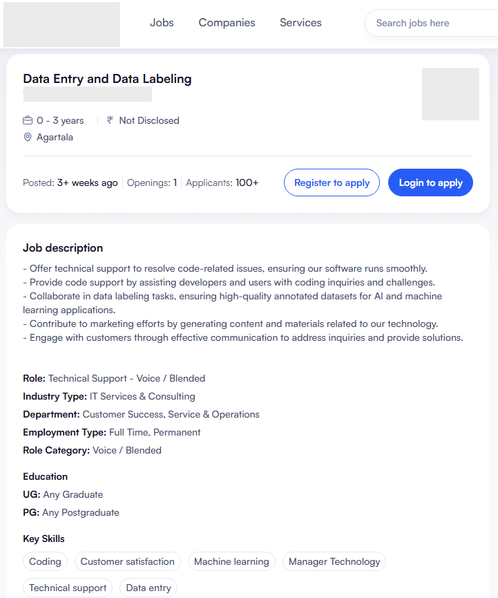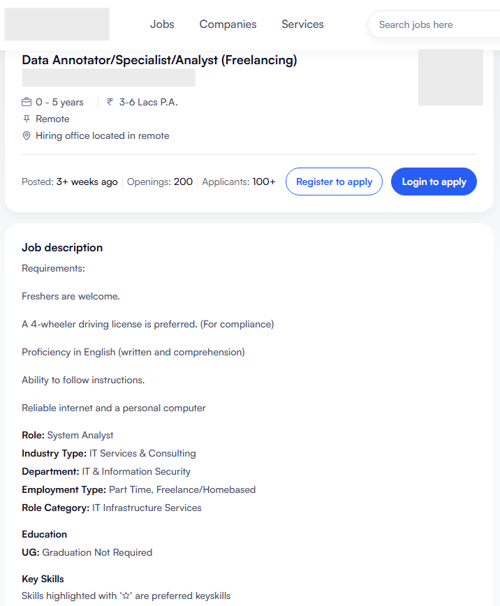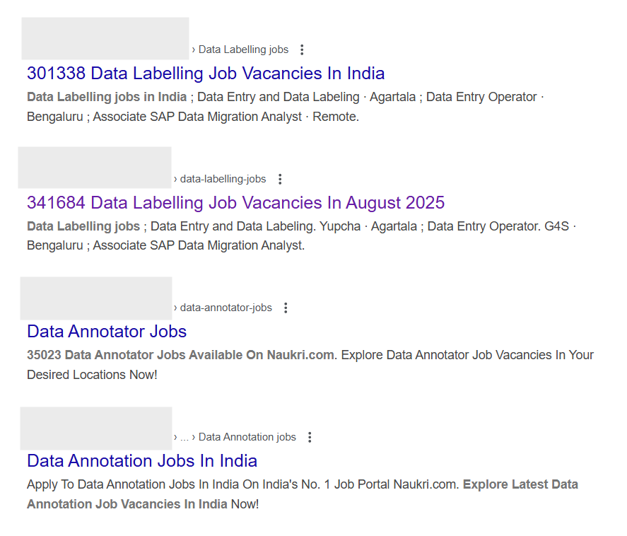 Platform gig and data work in AI supply chains are key present-day illustrations of the “reinstatement effect” (Acemoglu and Restrepo 2019) of technology. Job advertisements (see Figures 2, 3, and 4 below) for roles involving data work, like data validation and data annotation, list key competencies including data analysis, excellent written and verbal communication skills, attention to detail, among others. Figure 5 illustrates the rising demand for data workers in India (now emerging as a key hub for data annotation), powered by a diverse workforce, producing high-quality datasets for global use. In 2024, an estimated 50,000 Indian (freelance) annotators were present on international digital platforms, and 20,000 full-time annotators within India, according to this Economic Times report (citing data from TeamLease). The same report also states that the global market for data annotations is valued at an estimated US$8.22 billion, and is expected to grow swiftly at nearly 26.2% annually by 2028. From US$250 million in 2020-21, India is expected to service over US$7 billion of the global annotation market by 2030 (National Association of Software and Service Companies (NASSCOM, 2021). Even India’s ‘National Strategy for Artificial Intelligence’ identifies data annotation work as having the potential of “absorbing a large portion of the workforce that may find itself redundant due to increasing automation” (NITI Aayog, 2018). But, besides other issues, a concern is that the HITL model may lead to potential de-skilling of workers performing repetitive tasks to train or improve AI systems. Additionally, while location-based gig work has gained regulatory2 attention through collectivisation efforts (Tiwari 2025, Jain 2025, Elizabeth 2024) – often supported by informal labour unions and widespread public discussions – AI data workers remain largely absent from mainstream discourse.