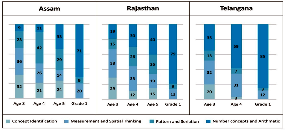 For example, in both Assam and Rajasthan, activities for younger children focus largely on non-number related topics and domains. In Telangana, on the other hand, workbooks for these children focus more on the number domain, along with topics related to spatial thinking and measurement.