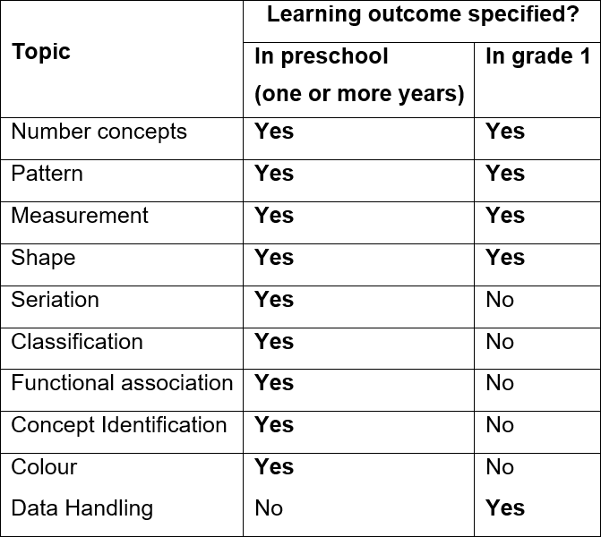 Table 1. Early mathematics topics and specification of learning outcomes in preschool and grade 1