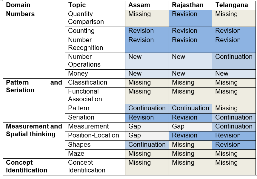 Notes: i) ‘Revision’ indicates that the textbook begins by revisiting concepts covered in the year immediately preceding grade 1. ii) ‘Continuation’ indicates that the textbook does not revise previous content but builds on content covered at the preschool stage (that is, it presumes learners have acquired adequate familiarity with the topic. iii) ‘Gap’ indicates that the topic is addressed in the textbook after a gap of one or more years, indicating some exposure at the preschool stage but not in the year immediately preceding grade 1. iv) ‘Missing’ indicates that the topic is not addressed in the grade 1 textbook, but is addressed at the preschool stage. v) ‘New’ indicates that the topic in the textbook was not introduced in any preschool year.