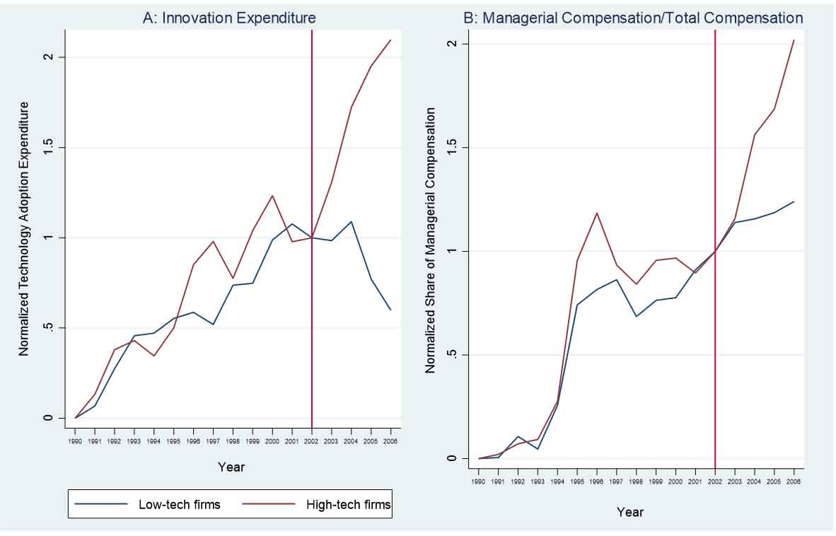 One of the main aims of our study is to examine if there is a causal link between innovation incentives and compensation structure, both within and between firms. A benchmark hypothesis in our study is that the increase in wage inequality between managers and non-managers, as a response to the IPR shock, is higher in the firms that were technological leaders at the time of the shock. Hence, following prior work (Branstetter et al. 2006), we split the firms into two groups – those above the median in terms of technological investments in each industry pre-2002 (‘high-tech’ firms) and those below the median (‘low-tech’ firms), and compare the response to the IPR shock of these two groups of firms in a ‘treatment-control’ design.
