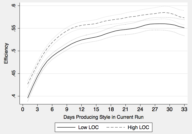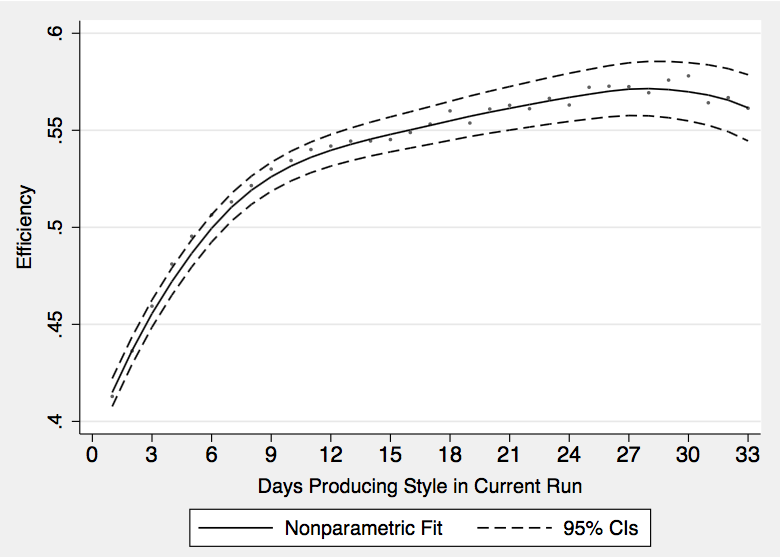 Figure 1 shows the basic learning curve in the garment production process. At the beginning of new ‘styles’, for example a white t-shirt, production lines start at a low efficiency level, around 40%. But after about two weeks of making the same style they converge to a ‘peak’ efficiency of around 60%. This is due to learning by doing.