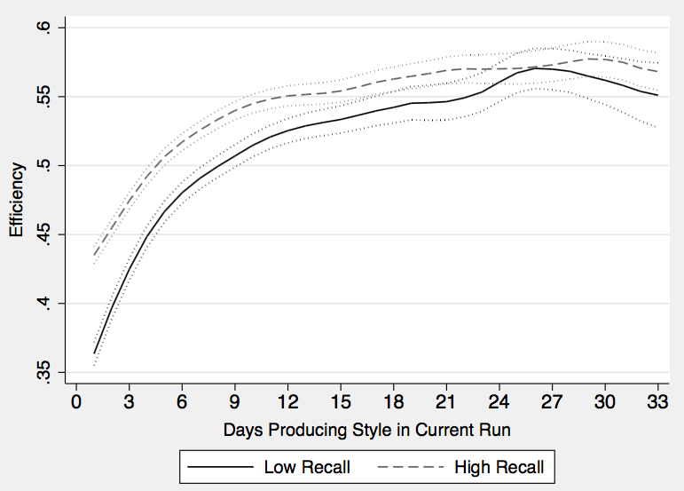 Along with learning comes forgetting – or what economists call a depreciation of knowledge over time – which is also an important driver of productivity. Figure 2 depicts how production lines ‘forget’ how to make styles efficiently if they have not made them for more than a few weeks.