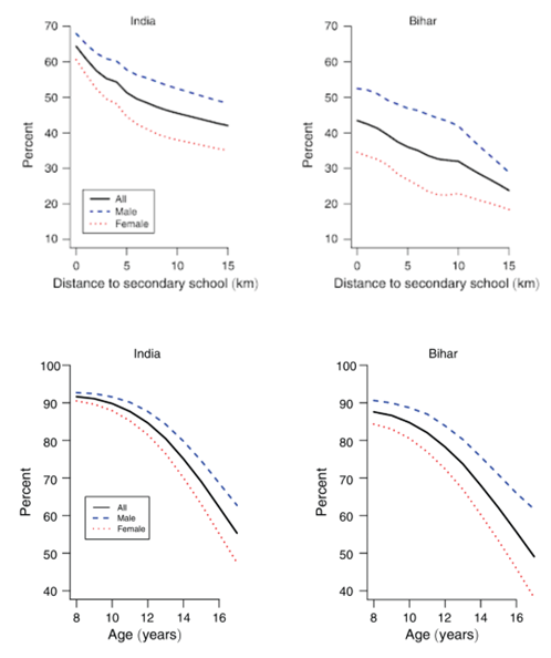 Figure 1. Gender gap in school enrolment in Bihar relative to the country overall, and with increasing distance to school
