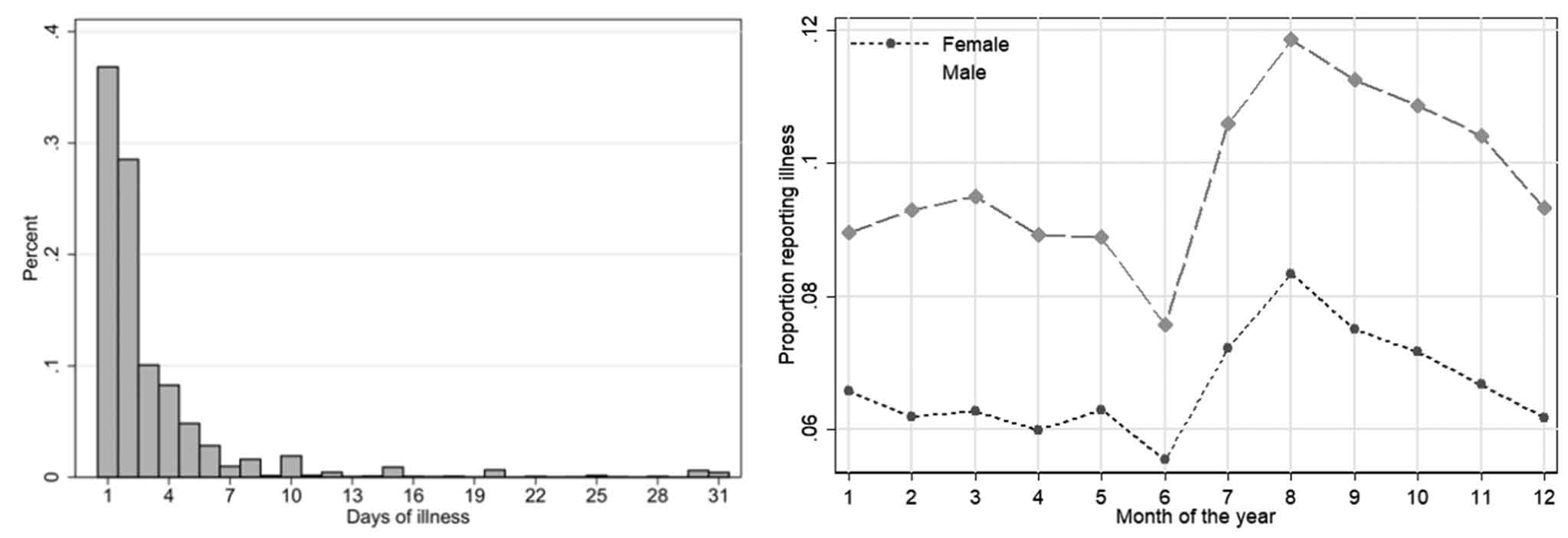 Figure 2. Days of illness (left panel) and seasonality in illness shocks (right panel)
