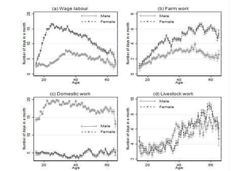 Most individuals in our sample are employed in the informal sector and work primarily as farm workers or in low- or semi-skilled jobs. Figure 1 presents the age-gender division of labour for these rural agricultural households where both female and male members specialise in activities based on their comparative advantages and the opportunity cost of time. Younger men spend more work-days in the wage labour market whereas older men spend more days working on their own farm or taking care of livestock. Women, on the other hand, are primarily involved in domestic chores. Both men and women spend an equal amount of time taking care of livestock.