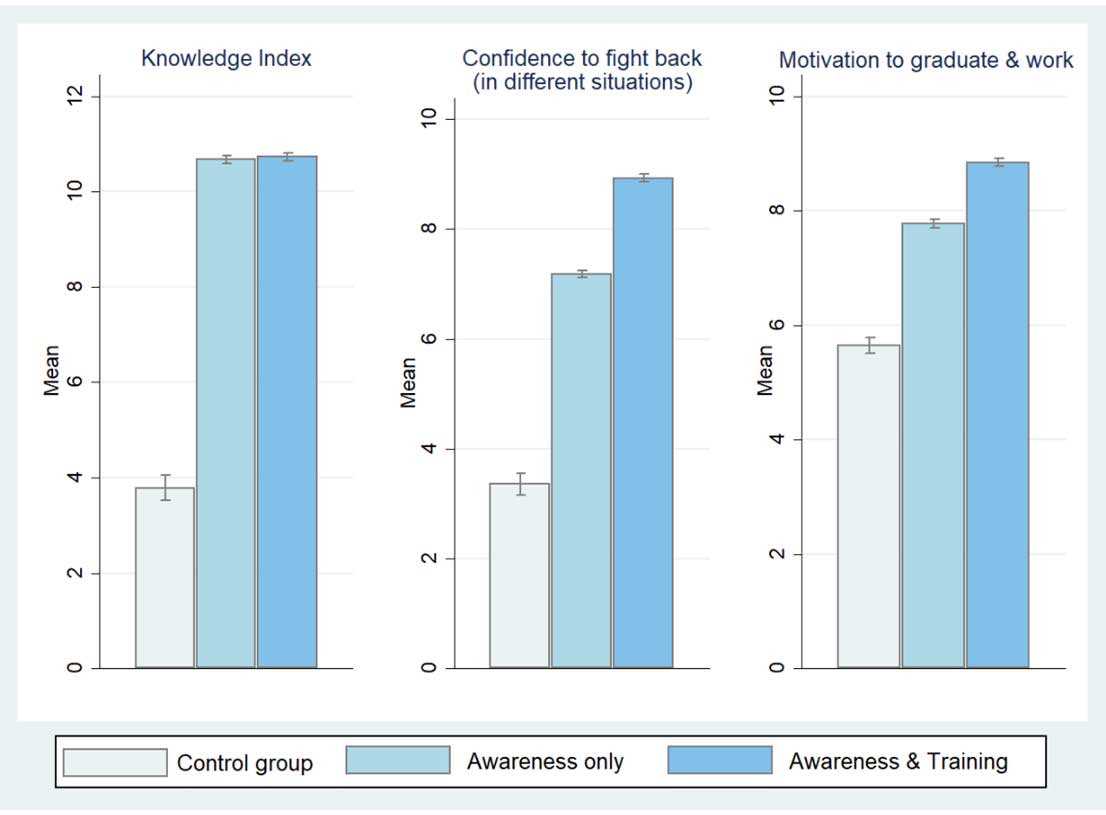 We find direct effects due to the intervention on students’ future aspirations. Students who receive either of the treatments have higher levels (approximately 2-3 points, on a scale of 0-10) of motivation to graduate and work (Figure 1). This impact is higher for the ‘A&T’ group relative to the ‘A’ group. The targeted intervention therefore makes the participants’ aware about their rights, the laws in place to protect them, and improves their confidence to fight back, which may act as channels to motivate them to graduate and work in the future.