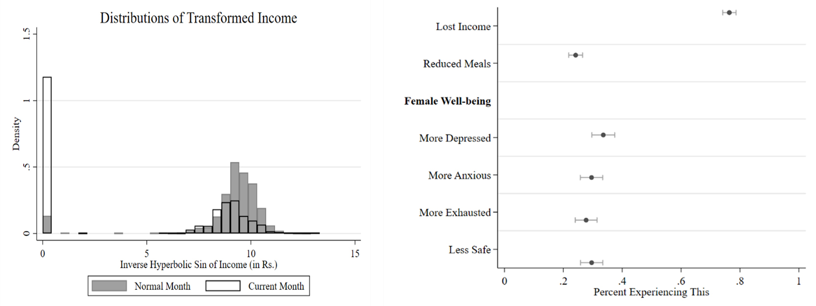 We find that the pandemic is associated with drastic income losses and increased food insecurity, as well as declines in female mental health and well-being. On average, the household head's reported monthly income fell from Rs. 8,625 in a normal month to Rs. 3,584 during Covid-19 – a decline of about 50% (Figure 1, left panel). The right panel shows that 76% of respondents report reduced income for themselves, and 24% report reduced meals for at least one household member.