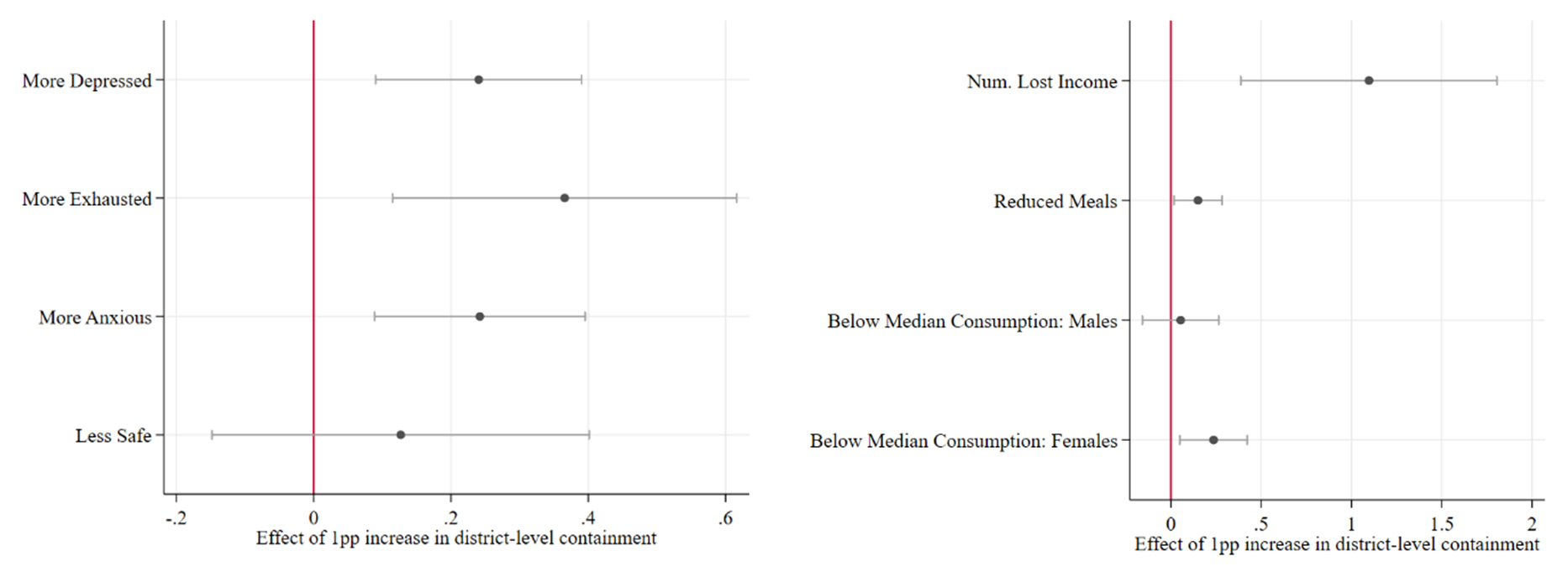 While potentially crucial from the perspective of public health, containment measures in India are associated with large negative consequences for both standard socioeconomic outcomes and outcomes that are harder to observe and measure, like mental health. The effects of containment policies may be similar in other low-income contexts with limited social insurance. In such settings, more vulnerable populations, such as women, may be particularly affected by both the direct effects of the pandemic, and related policies such as containment. Our findings suggest that policymakers should target aid – particularly access to food – to vulnerable households and women.
