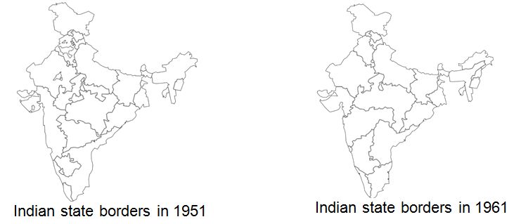 The castes targeted by affirmative action policies were defined after the writing of the Constitution in 1949 by each state, by geographical area within the state. Hence, some castes were considered as SC in one state, but not in another, and within a state, in a given area while not in another. Moreover, in 1956, the borders of Indian states changed drastically (Figure 2) but the geographical definition of the SC lists remained unchanged. This greatly multiplied the cases in which a caste could be considered as SC in one part of a state and not in another part of the same state: those cases were labelled “area restrictions”.