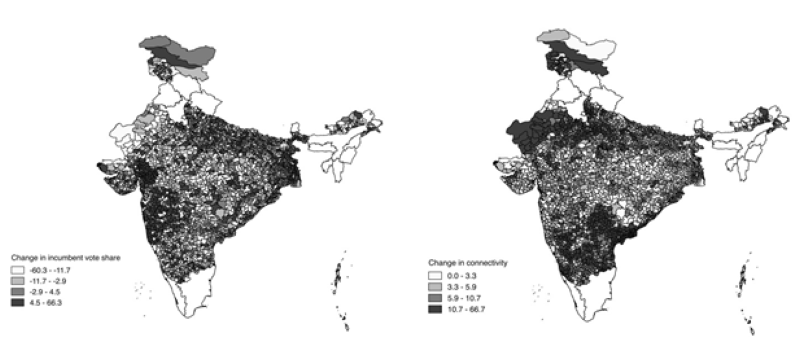 The figure on the right below shows the massive change in connectivity across India and over time, and the figure on the left shows the change in state-level incumbent vote share, both in the pre-delimitation period for state assembly constituencies. A lack of correlation between the two maps is apparent.