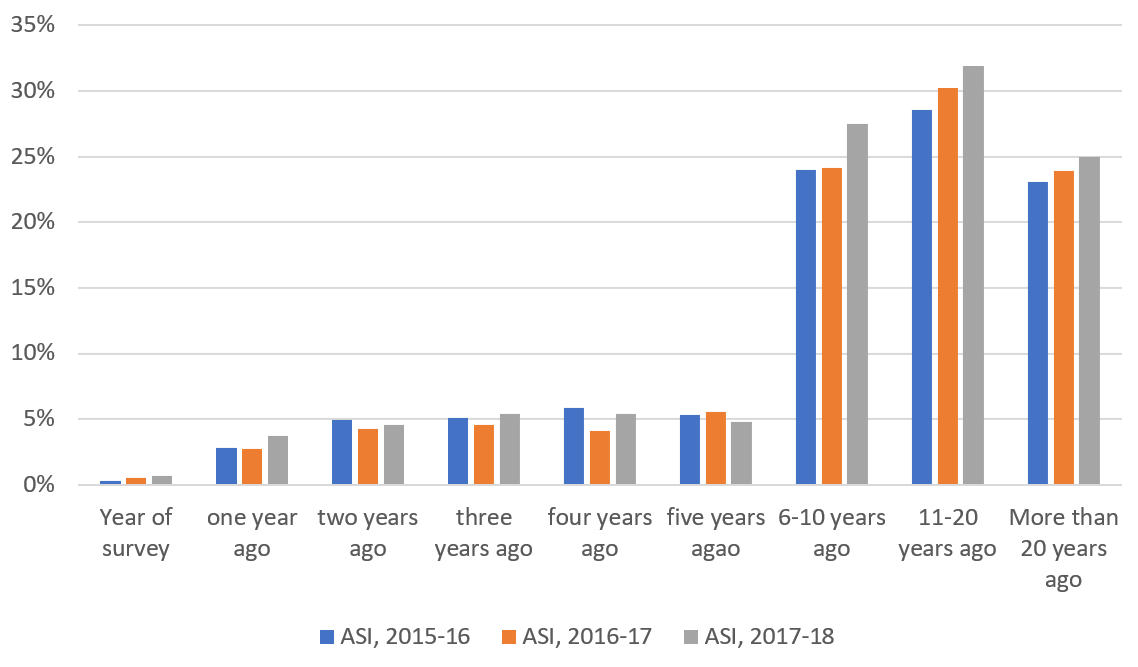 Average employment in India’s organised manufacturing during the period between 2015-16 and 2017-18 went above that of the triennium of 2005-06 to 2007-08 by 4.7 million. About 15% of the increase in employment can be attributed to the transition of informal manufacturing enterprises to formal manufacturing enterprises. It was discovered while examining the unit-level data of ASI, that a portion of the factories covered in the survey for 2015-16 have not been covered previously in any of the surveys from the year 1998-99 to 2014-15 (these are ‘newly surveyed’ factories). In the same way, newly surveyed factories are identified for 2016-17 and 2017-18, and the year of initial production is tabulated for all these factories. The distribution obtained is presented in Figure 2. It can be noticed that a dominant portion of the newly surveyed factories started production 11 to 20 years ago, or even earlier.