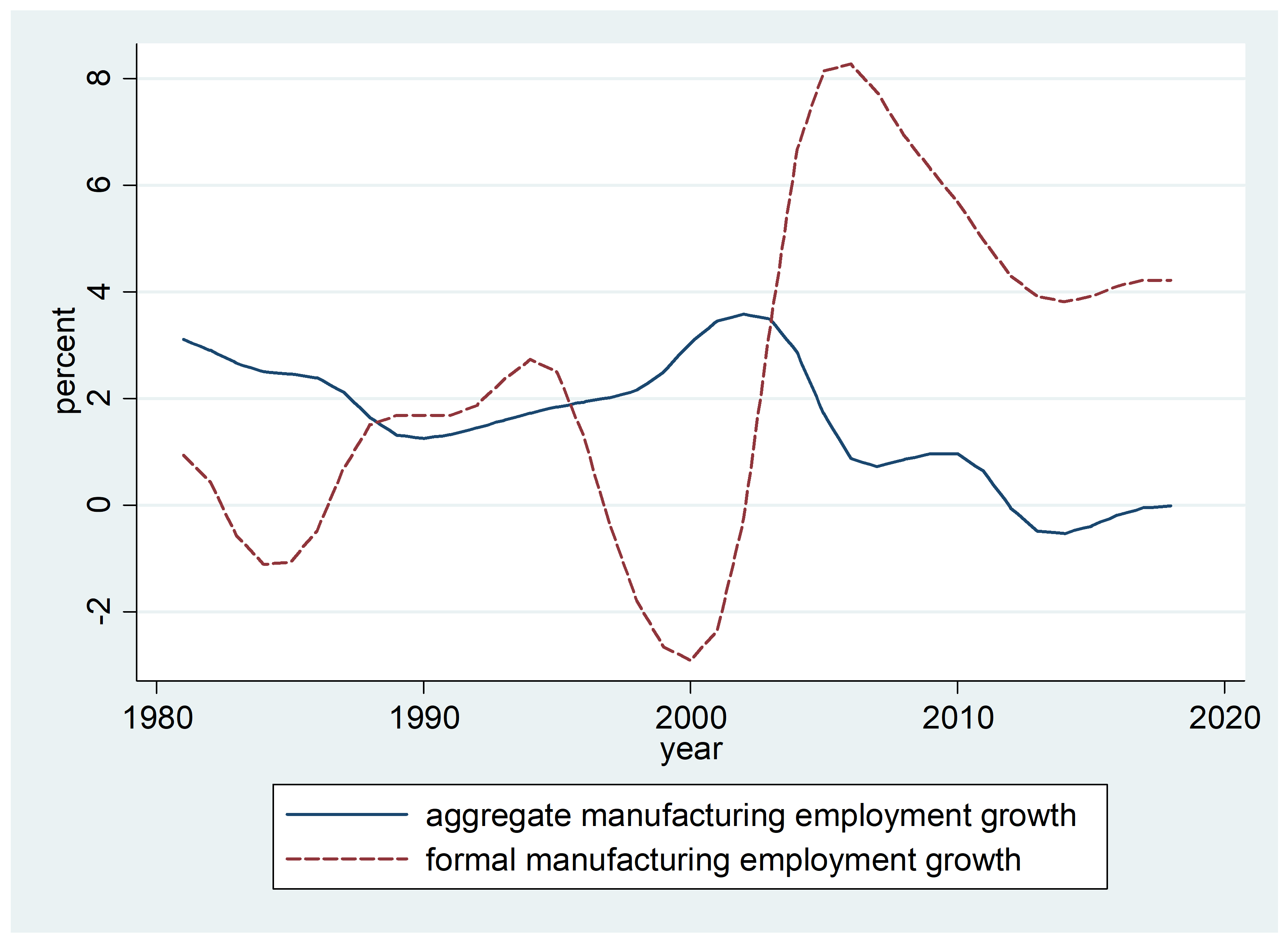 Figure 1. Employment growth rate in formal manufacturing and aggregate manufacturing, smoothened