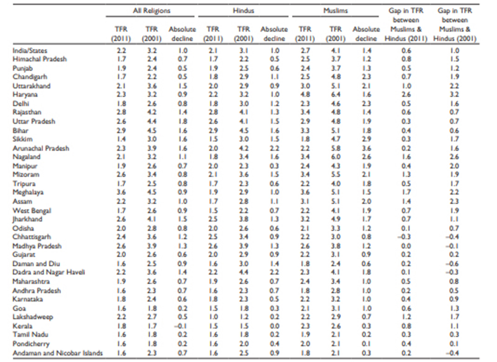 तालिका 1 में राज्य स्तर पर हिंदुओं और मुस्लिमों में प्रजनन के अंतर को दर्शाया गया है। अखिल भारतीय स्तर पर, 2001 और 2011 के बीच टीएफआर में प्रति महिला 1.0 बच्चे की गिरावट थी। हिंदुओं में टीएफआर 3.1 से घटकर 2.1 हो गया (2.1 के टीएफआर को प्रजनन का 'प्रतिस्थापन स्तर' कहा जाता है, यह वह दर है जिस पर जनसंख्या एक पीढ़ी से दूसरी पीढ़ी में खुद को बदल लेती है) और यही दर मुस्लिमों में 4.1 से 2.7 तक हो गया- यानि प्रति महिला 1.4 बच्चों की कमी आई। दक्षिणी राज्यों के अलावा, अधिकांश उत्तर-पश्चिमी और पूर्वी राज्यों में हिंदुओं में टीएफआर प्रतिस्थापन स्तर पर या उससे नीचे है। हालांकि हरियाणा, राजस्थान, उत्तर प्रदेश, बिहार, झारखंड और मध्य प्रदेश जैसे राज्यों में हिंदुओं में टीएफआर प्रतिस्थापन स्तर तक नहीं पहुंचा है, लेकिन इन राज्यों की हिंदू आबादी में प्रति महिला एक या अधिक बच्चों की शुद्ध कमी देखी गई है।