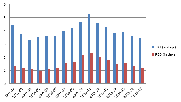 An important indicator of the operational efficiency of ports is the turnaround time or Turn Round Time (TRT) – defined as the time spent by a vessel at the port from its arrival at the reporting station to its departure from the reporting station. Analysis of the trends for TRT in respect of major Indian ports for the period 2001-02 to 2016-17 reveals that there was, at the port-average level, an upward trend in this indicator (suggesting fall in efficiency) during 2003-04 to 2010-11, and a downward trend (suggesting improvement) thereafter (Figure 1). The average TRT of major ports in 2010-11 was about 5.3 days, which came down in 2016-17 to about 3.4 days. A similar trend is seen in another operational efficiency indicator, namely pre-berthing waiting time or detention (PBD), measured as the number of days of detention/delay before berthing of vessels, on average, during the year.