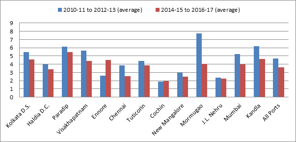 The downward trend in TRT (hence, improvement in port efficiency) during 2010-11 to 2016-17 has continued subsequently. The average TRT came down from 82.3 hours in 2016-17 to 64.3 hours in 2017-18, and further to 60.5 hours in 2018-19 (up to 31 October 2018) (Government of India, 2018). However, even with this fall, the average TRT level in India’s major ports reached now still remains more than two times the TRT level in some of the best-performing ports in the world. The ship turnaround time in some international ports in 2014 was less than one day in the ports of Kelang/Klang, Shanghai, Yokohama, Barcelona, and Tarngier, and it was between one and two days in Singapore, Hamburg, Rotterdam, and Antwerp (Ports Regulator of South Africa, 2016). A comparison made of vessel turnaround time for 2010, between some Indian ports and some international ports in a report of the Planning Commission brings out that the turnaround time was 46 hours in Cochin, and 28 to 32 hours in Chennai, Tuticorin, and J.L. Nehru Port, whereas it was only 13 hours in Hong Kong, and 14 hours in Singapore.