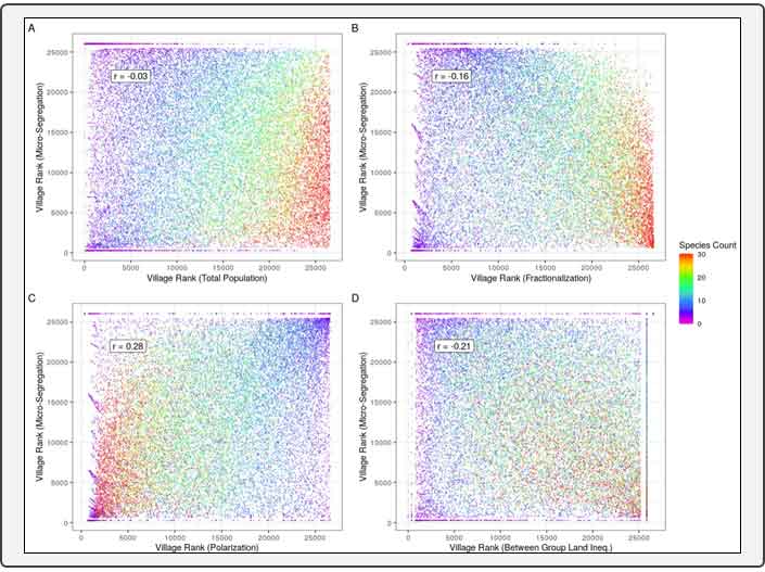 Notes: (i) The four panels show how micro segregation is independent of other diversity measurements (jati categories are used in all panels). ii) All panels plot ranking of villages by micro segregation against ranking of villages by the respective variables.
