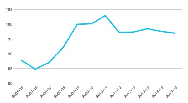 While the terms of trade had already started turning against agriculture after 2011-12, it worsened in the next two years. Figure 1 shows the terms of trade between farmers and non-farmers. The last time the index of terms of trade had moved against farmers was during 1997-2003. It had recovered after that with the index moving up from 85 in 2004-05 to 103 by 2010-11, driven by generous MSP increases and a general rise in food inflation. But it declined soon after and has remained at this level ever since (Figure 1).