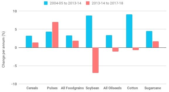 Except for pulses, which have seen output grow faster between 2013-14 and 2017-18, all other crops and crop groups have seen a sharp deceleration in output growth.