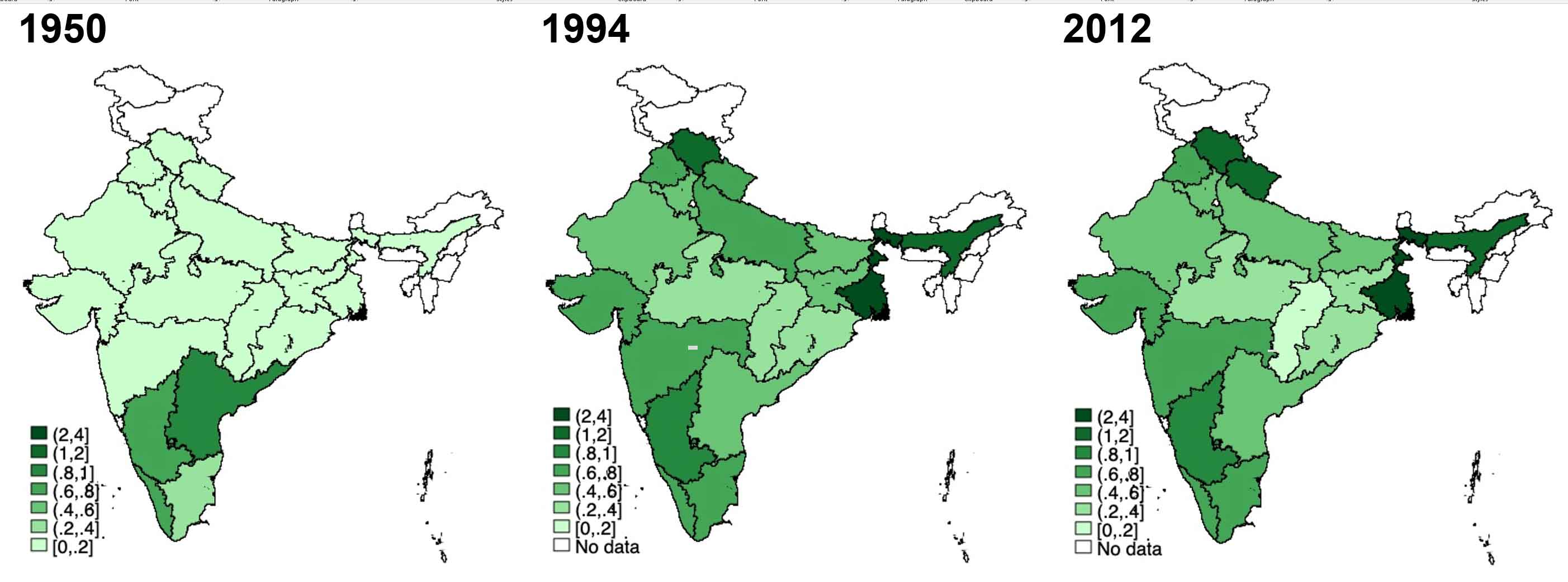 I measure redistribution as the proportion of developmental spending that goes into social sectors, based on budget data from the Reserve Bank of India. I use data on the caste background of MLAs (members of legislative assembly) mentioned earlier, to measure political representation and draw on several sources3 to generate a dataset on OBC reservations since the colonial period. Caste is not the only factor that shapes development and hence, I account for a host of economic, political, and social factors, including state capacity, income, political ideology of ruling coalition, and political participation that have been shown to affect redistribution. Overall, this analysis includes 16 major states, accounting for about 95% of the population, from 1960 to 2012.