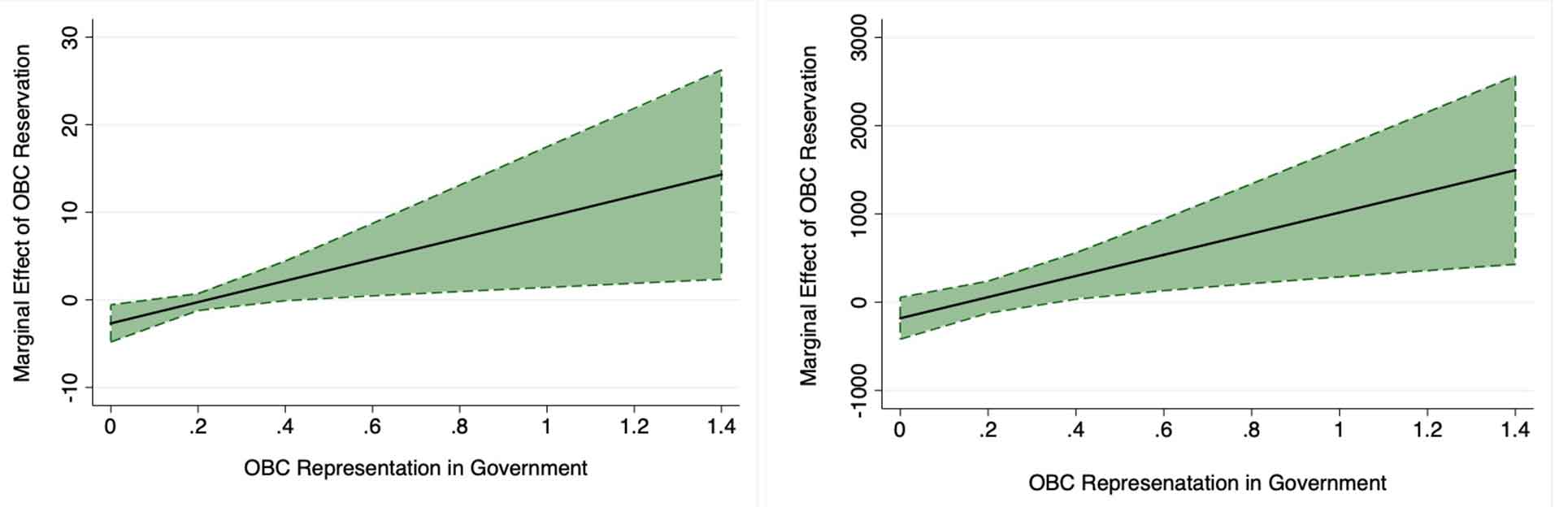 Contrary to expectation, I find that both SC and OBC political representation are not associated with redistributive spending. However, places with higher OBC political representation in combination with higher OBC reservation in the bureaucracy are more likely to spend more in social sectors. I plot the marginal effect of OBC reservation on redistribution, measured through both proportional and absolute social spending, in Figure 3.