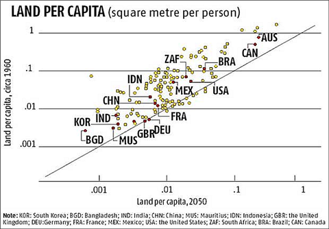 India was land-scarce relative to most countries in 1960. However, by 2050, its land-to-population ratio will have declined fourfold, and India will be amongst the most land-scarce countries in the world (there are only a handful of countries to the left of India, including Bangladesh, Mauritius and the Netherlands). China in 2050 will have nearly four times as much land per person as India, and Brazil nearly 20 times as much. This is not surprising. Consider, for example, that just between 1991 and 2011 India added more people than its entire population at the time of independence; or more people than the entire population of the United States — in one-third of the land area.