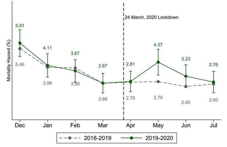 मृत्यु दर में परिवर्तन का अध्ययन करने के लिए हम लॉकडाउन से पहले और बाद के चार महीनों तक मासिक मृत्यु दर खतरे या उन जीवित लागों की संख्या को चिन्हित करते हैं जिनकी मृत्यु एक महीने के दौरान हो जाती है। यह जांचने के लिए कि क्या मासिक या मौसमी उतार-चढ़ाव से मृत्यु दर में कोई परिवर्तन हो सकता है, हम रोगियों के समान समूह में पिछले वर्ष की मृत्यु दर तथा अपने सर्वेक्षण के प्रतिदर्श में मृत्यु दर की तुलना करते हैं। दोनों समूहों में दिसंबर और मार्च के दौरान मृत्यु दर में लगातार गिरावट आती है। यह अपेक्षित है, क्योंकि बीमार और सबसे कमजोर रोगियों की जल्दी मृत्यु होने की दर उच्च होती है। हालांकि मार्च और मई 2020 के बीच (लॉकडाउन के एक महीने के बाद), यह ट्रेंड उलट जाता है और मृत्यु दर 64% बढ़ जाती है। पिछले वर्ष में मृत्यु दर में इतनी वृद्धि नहीं देखी गई है। कुल मिलाकर अप्रैल-जुलाई 2020 के दौरान मृत्यु दर की तुलना मार्च 2020, और अप्रैल-जुलाई 2019 के दौरान मृत्यु दर की तुलना करने पर हमारा अनुमान है कि लॉकडाउन के बाद के चार महीनों में कुल अतिरिक्त मृत्यु दर 22-25% हो जाती है।