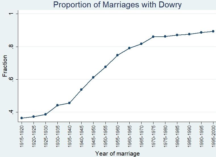 पिछली सदी में जहां कुछ वैवाहिक प्रचलनों में कोई बदलाव नहीं हुआ, वहीं दहेज के प्रचलन में काफी बदलाव आया है। जैसा कि नीचे दी गयी आकृति 1 में दर्शाया गया है, 1940 के पहले लगभग 40 प्रतिशत विवाहों में ही दहेज दिए जाते थे। वहीं, 1940 से 1075 के बीच पूरे भारत में दहेज अपनाने के मामले में काफी तीव्रता आई और 1975 तक लगभग 90 प्रतिशत विवाहों में दहेज भुगतान किया जाने लगा।2
