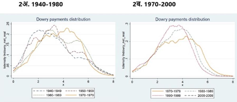 नीचे दी गयी आकृति 2 में 1940 से 2000 के बीच के हर दशक के लिए वास्तवित दहेज भुगतानों के संपूर्ण वितरण का डेंसिटी प्लॉट दर्शाया गया है। रेखा (कर्व) की ऊंचाई किसी निजी दशक में उतने दहेज देकर हुए विवाहों के अनुपात को दर्शाती है। दहेज भुगतान के विकास को मोटे तौर पर दो चरणों में बांटा जा सकता है: