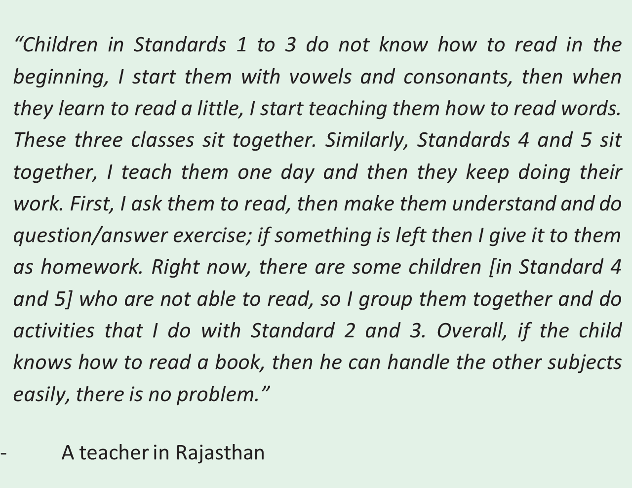 mentioned earlier their methods are often more traditional than aligned with the NIPUN Guidelines. There were only four snapshots where most students were doing a play-based learning activity; in 55 snapshots students were engaged in choral repetition either led by the teacher or another student.4 In about a quarter of these snapshots (64), students were doing a writing activity – either copying or taking dictation (independent writing was not recorded in any of the snapshots). Small-group activities were observed in just one classroom. Perhaps most strikingly, despite the influx of TLM into schools across the country, students were observed using any form of TLM other than textbooks and notebooks in just six snapshots.