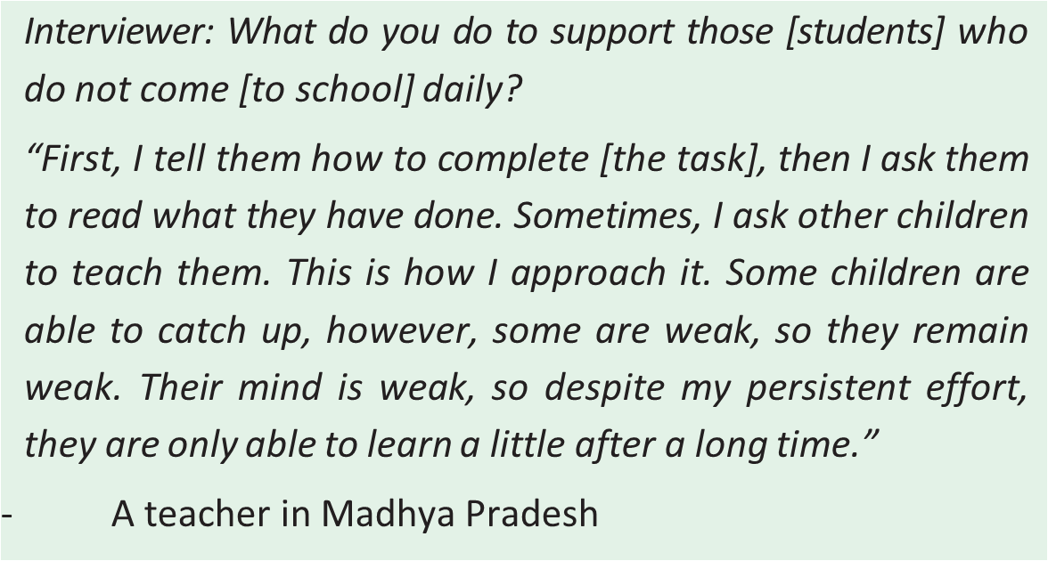 However, this attitude did not always extend to the belief that all children can learn. Despite these feelings of kindness and understanding towards young children, many teachers continued to categorise students into ‘bright’ students who can learn and ‘weak’ ones who cannot. As discussed below, students’ abilities and learning levels did not appear to inform observed teachers’ overall approach to classroom teaching.